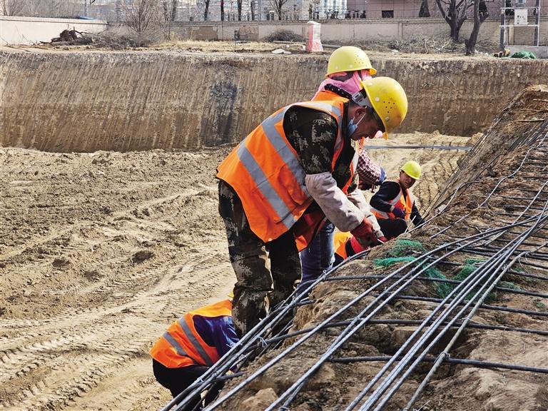 來到紅古區(qū)托育服務(wù)中心建設(shè)項目施工現(xiàn)場,基坑中十余名工人正在進行基坑邊坡支護作業(yè)!拔沂嵌碌讈淼焦さ厣祥_始參與施工的,現(xiàn)在我們幾個人正在進行基坑支護,是技術(shù)活也挺費力氣,工資收入不錯,我干勁也很足!闭诩t古區(qū)托育服務(wù)中心建設(shè)項目工人李勝輝邊捆扎鋼筋邊對記者說。